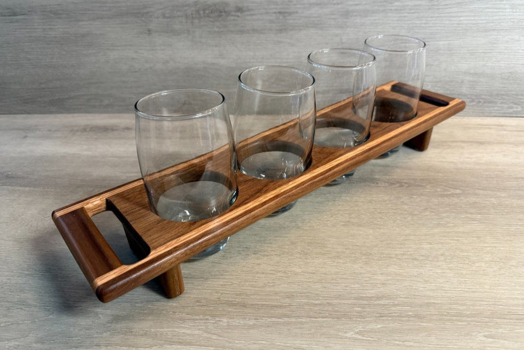 Use this beautiful Walnut & Red Oak Flight Set to serve beer, coffee or any other beverages you prefer. This set includes the Walnut & Red Oak wood stand as well as 4 glasses. The tray measurements are 4 1/2" wide x 19 3/4" long x 2 3/8" high. The drink ware is oz glasses.